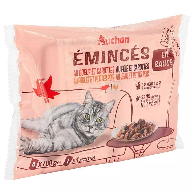 Ingrédients : EMINCÉS EN SAUCE AU BŒUF, FOIE ET CAROTTES : Viandes et sous-produits animaux (dont bœuf 4%, dont foie 4%), céréales, poissons et sous-produits de poissons, extrait de protéines végétales, sous-produits d'origine végétale (inuline de chicorée 0.4%), substances minérales, légumes (carottes déshydratées 0,45% - équivalent à 4% de carottes), sucres. EMINCÉS EN SAUCE AU BŒUF , AGNEAU ET CAROTTES : Viandes et sous-produits animaux (dont bœuf 4%, dont agneau 4%), céréales, poissons et sous-produits de poissons, extrait de protéines végétales, sous-produits d'origine végétale (inuline de chicorée 0.4%), substances minérales, légumes (carottes déshydratées 0,45% - équivalent à 4% de carottes), sucres. EMINCÉS EN SAUCE AU POULET ET PETITS POIS : Viandes et sous-produits animaux (dont poulet 4%), céréales, poissons et sous-produits de poissons, extrait de protéines végétales, substances minérales, sous-produits d'origine végétale (inuline de chicorée 0.4%), légumes (petits pois déshydratées 0.45% - équivalent à 4% de petits pois), sucres. EMINCÉS EN SAUCE AU VEAU, FOIE ET PETITS POIS : Viandes et sous-produits animaux (dont veau 4%, dont foie 4%), céréales, poissons et sous-produits de poissons, extrait de protéines végétales, sous-produits d'origine végétale (inuline de chicorée 0.4%), substances minérales, légumes (petits pois déshydratées 0.45% - équivalent à 4% de petits pois), sucres.