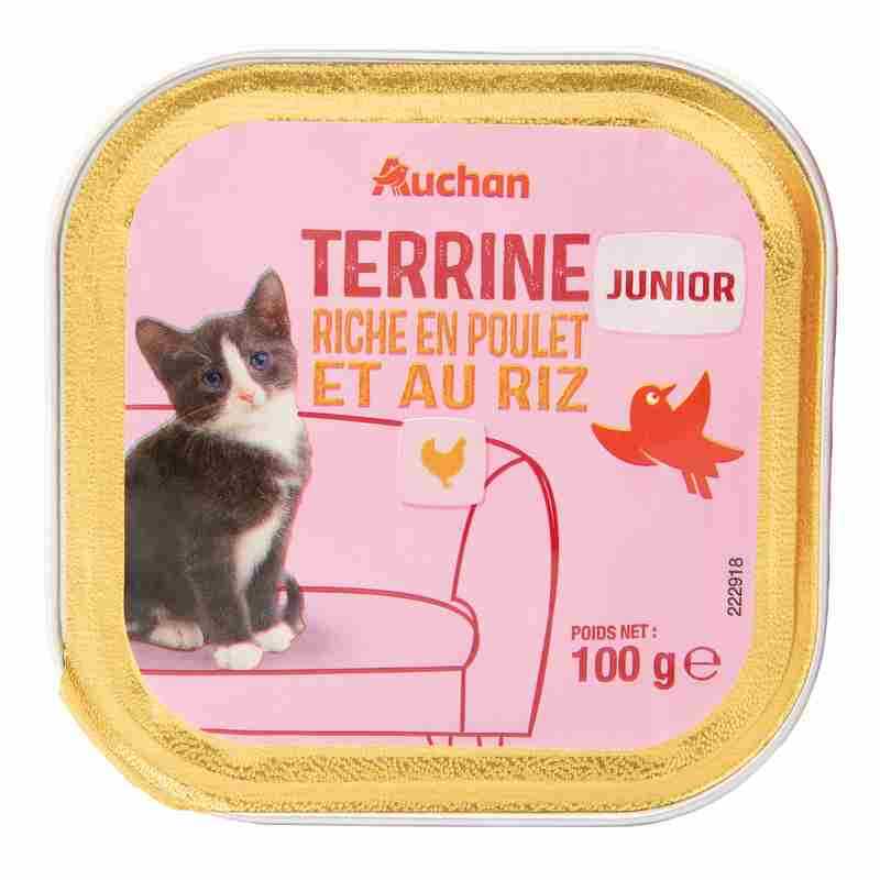 AUCHAN CHATON RICHE EN POULET ET AU RIZ BARQUETTE 100G