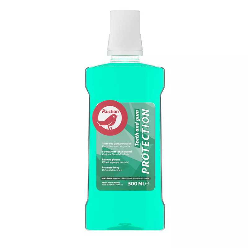 Le bain de bouche Protection dents et gencives AUCHAN réduit la plaque dentaire et renforce l'émail des dents. Sa formule au fluor prévient les caries. Arôme menthe fraîche. Convient pour un usage quotidien. Bain de bouche PROTECTION