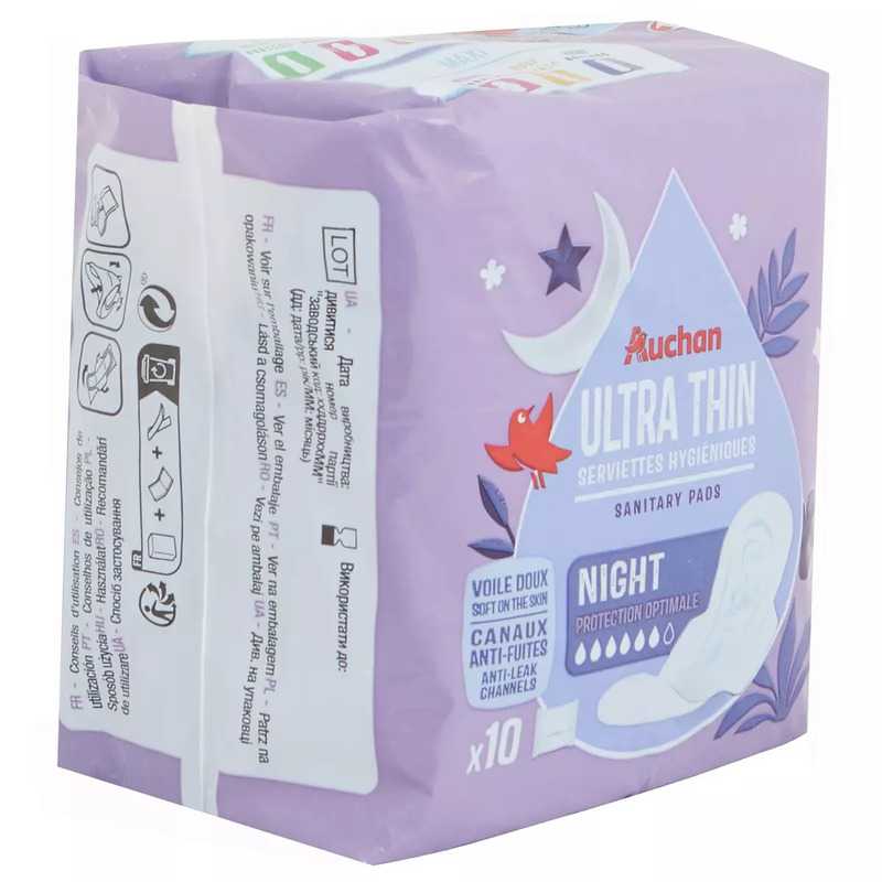 AUCH - Serviettes Hygiéniques - Ultra Fines - NIGHT - 10 PCS Passez une bonne nuit avec les serviettes hygiéniques Auchan ! Super absorbantes, leur forme allongée anatomique avec ailettes vous offre 8 heures de protection et un confort maximal grâce à leur voile doux. Facile à emporter avec leur emballage individuel sous pochettes.