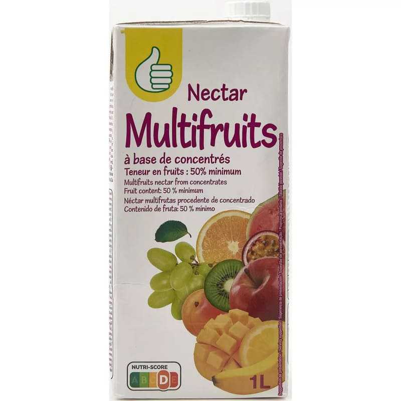 Ingrédients : Eau, jus de pomme à base de concentré, purée de pêche à basede concentré, jus de raisin à base de concentré, purée de banane, purée de mangue à base de concentré, jus d’orangeà base de concentré, jus de fruit de la passion à base de concentré, jus de citron à base de concentré, jus d’ananas à base de concentré, purée de goyave à base de concentré, purée d’abricotà base de concentré, acidifiant: acide citrique, antioxydant: acide ascorbique,édulcorant: glycosides de stéviol issu de Stévia , vitamine: bêta-carotène (Pro A).