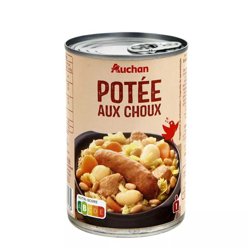 Ingrédients : Choux blancs 28%, eau, viande de porc traitée en salaison et précuite 13.5% [viande de porc (Origine: UE)12%, eau, sel, stabilisant : triphosphates, gélifiant : algues Euchéma transformées, conservateur : nitrite de sodium], saucisses fumées pur porc 13.5 % [viande de porc (Origine: UE), eau, plasma de porc, sel, arôme naturel, stabilisant : triphosphates, sirop de glucose, conservateur : nitrite de sodium)], pommes de terre 7%, haricots blancs trempés 5%, carottes 5%, poireaux 2,5%, sel, affermissant : chlorure de calcium. Traces éventuelles de lait et de gluten. Pourcentages exprimés par rapport au poids net total.