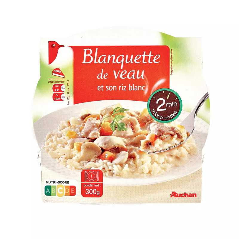 Ingrédients : Riz cuisiné précuit 31,6% (eau, riz, huile de colza, sel), eau, viande de veau préparée en salaison précuite 25% (viande de veau*, eau, sel, stabilisant: triphosphates, polyphosphates), carottes (6,5%), champignons (3,4%), crème (LAIT) (2,6%), amidon modifié, farine de BLÉ, huile de colza, arômes, vin blanc, sel, jus de citron concentré. Les % sont exprimés sur l’ensemble de la recette. *Origine viande : Union Européenne Conditionné sous atmosphère protectrice