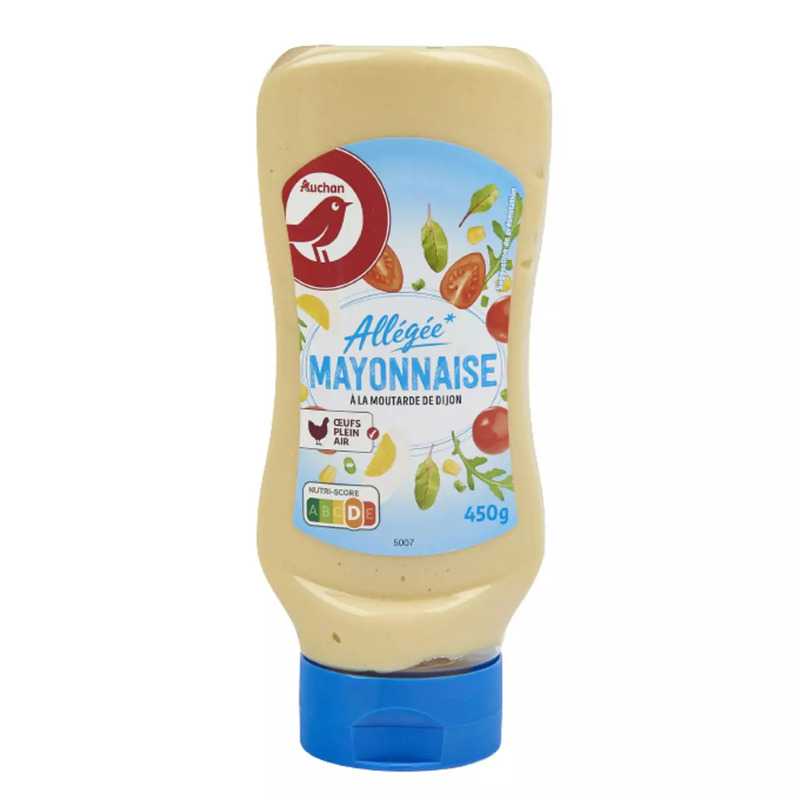 Ingrédients : Eau, huile de colza 22.5%, MOUTARDE de Dijon (eau, graine de MOUTARDE, vinaigre d'alcool, sel, antioxydant: diSULFITE de potassium, acidifiant: acide citrique), sucre, amidon modifié, jaune d'OEUF de poules élevées en plein air 3,7%, sel, vinaigre d'alcool, acidifiant: acide lactique, épaississant : gomme xanthane, arôme, colorants : lutéine et extrait de paprika, conservateur: sorbate de potassium, antioxydant: E385.