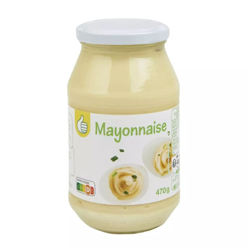 Ingrédients : Huile de colza 70%, eau, jaunes d’ŒUFS de poules élevées en plein air 6%, MOUTARDE de Dijon (eau, graines de MOUTARDE, vinaigre d'alcool, sel, antioxydant: diSULFITE depotassium, acidifiant: acide citrique), vinaigre d'alcool, sel, sucre,amidon modifié colorants : lutéine et extrait de paprika arôme