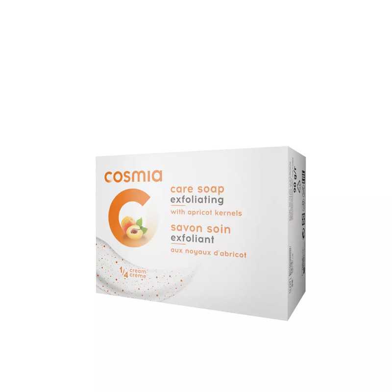 Faites peau neuve avec le savon soin exfoliant COSMIA ! Enrichi en noyaux d'abricots, il élimine délicatement les peaux mortes de votre visage comme de votre corps. Et pour plus de douceur, sa formule contient 1/4 de crème hydratante. Fabriqué en Europe