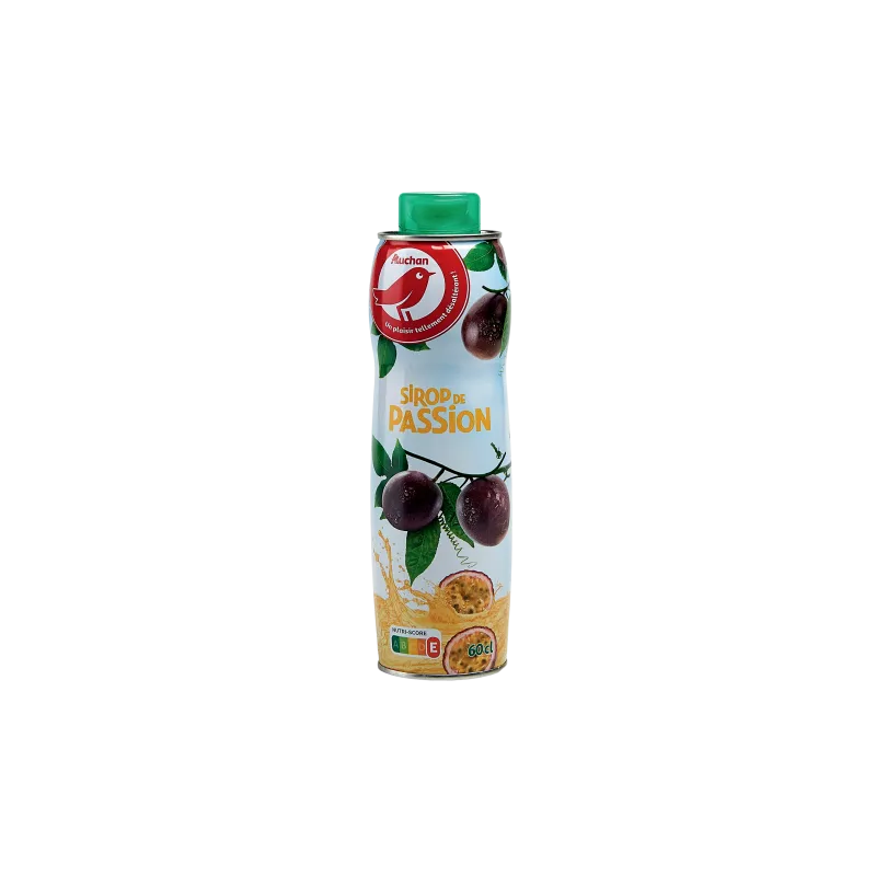 Ingrédients: Sucre, sirop de glucose-fructose, jus de fruits à base de concentrés 30% (passion 20%, citron 10%), eau, colorants : lutéine (extrait de tagète), extrait de paprika, acidifiant : acide citrique, arôme, conservateur : sorbate de potassium, stabilisant : ester glycérique de résine de bois.