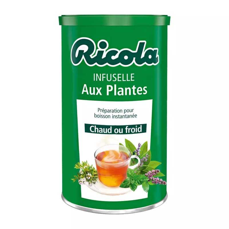 Ingrédients: sucre, dextrose, extrait (2,5 %) de plantes : menthe, camomille, verveine, fleur d’oranger, tilleul ; sucre caramélisé, extrait (0,3 %) du mélange de 13 plantes Ricola : plantain, guimauve, menthe, thym, sauge, alchémille, achillée, pimprenelle, mauve, fleurs de sureau, primevère, véronique et marrube ; arômes naturels de menthes.